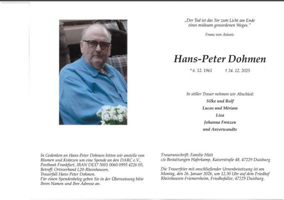 Die Angehörigen gestatten uns allen, Hans-Peter als letzten persönlichen Gruß am Grab – anstelle von Blumen – jeweils eine QSL-Karte mit auf seinen letzten Weg zu geben. Von dieser Möglichkeit kann gerne Gebrauch gemacht werden.