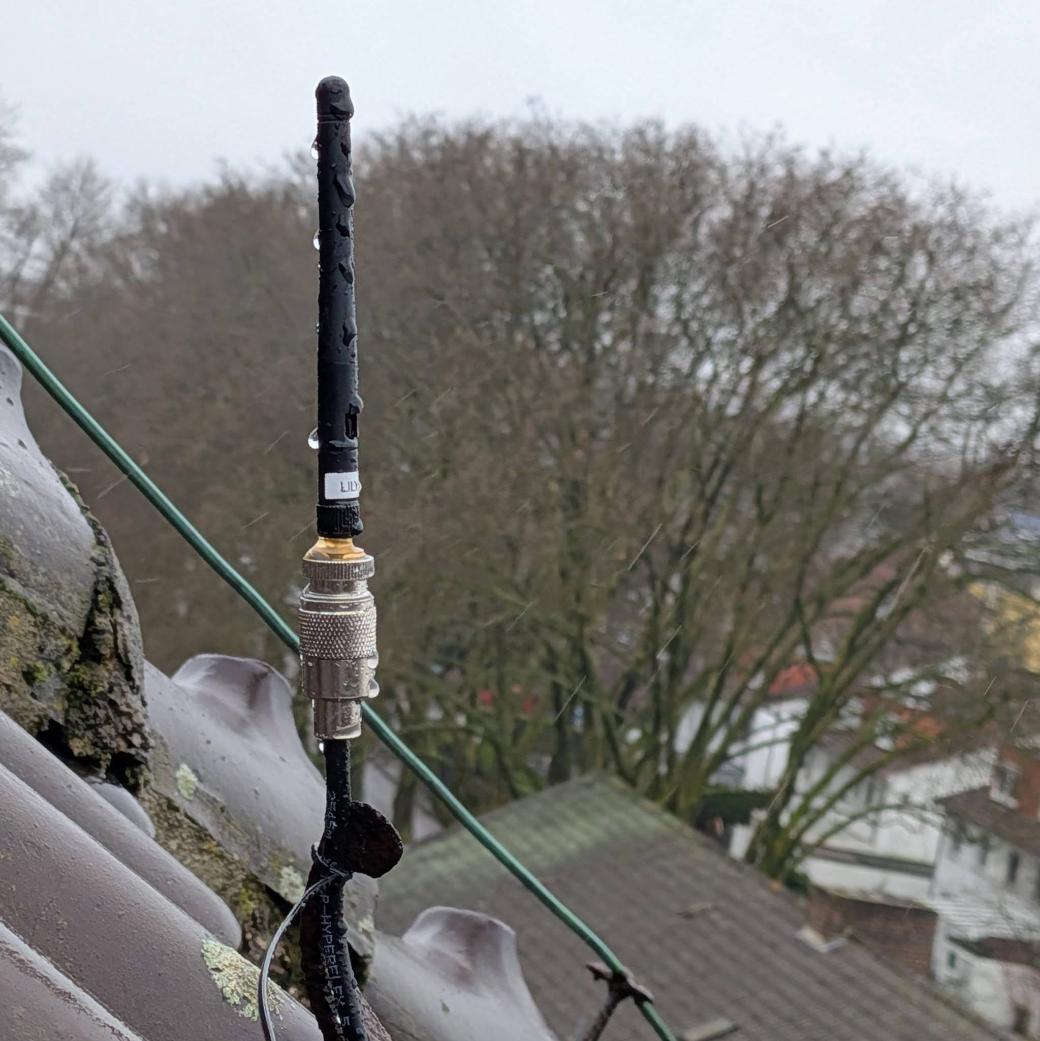 Dem Vorsitzenden war es wichtig, vorausschauend weitere Kabel einzuziehen. Am Anbau auf dem Flachdach befindet sich ein kippbarer Mast. Der soll in Zukunft für Antennenexperimente verwendet werden. Zunächst ist eine Antenne für 6 Meter geplant. Natürlich muss auch diese mit Kabeln versorgt werden, einem Koax Kabel und einer Steuerleitung für einen Rotor. Leider reichten die Längen der Kabel nur bis unter das Dach. Nachschub ist bereits geordert.